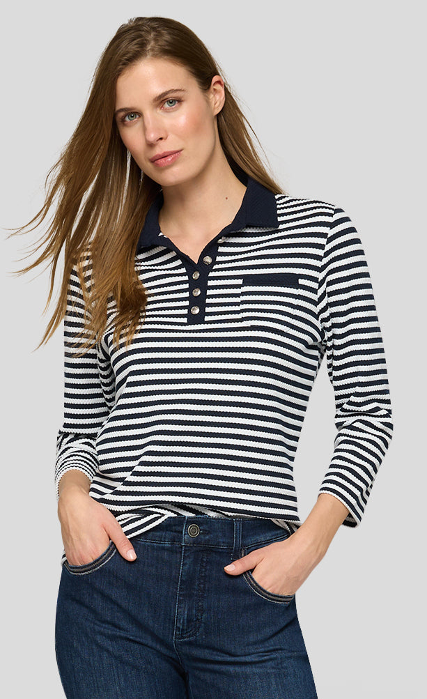 3/4 SLV STRIPE POLO NAVY/WHITE 83% POLY/12% VIS/5% ELASTANE