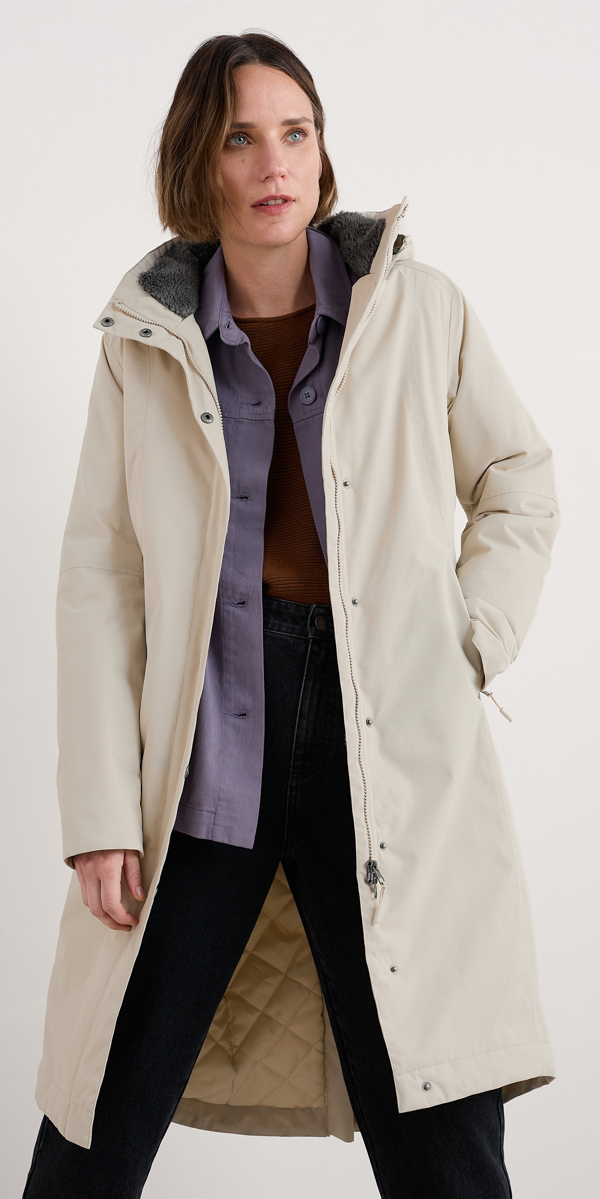 Made to last from year to year, our much-loved Janelle raincoat has a recycled nylon Tide Cycle® outer. Its relaxed shape allows for plenty of cosy layers underneath, and it falls to the knee for extra coverage. The upper half is lined with soft recycled fleece, while quilted lining at the bottom gives you ease of movement as well as warmth. Designed for the Cornish elements, the detachable hood has a peak to protect your face, and there are reflective strips for cloudy days and nighttime walks.
