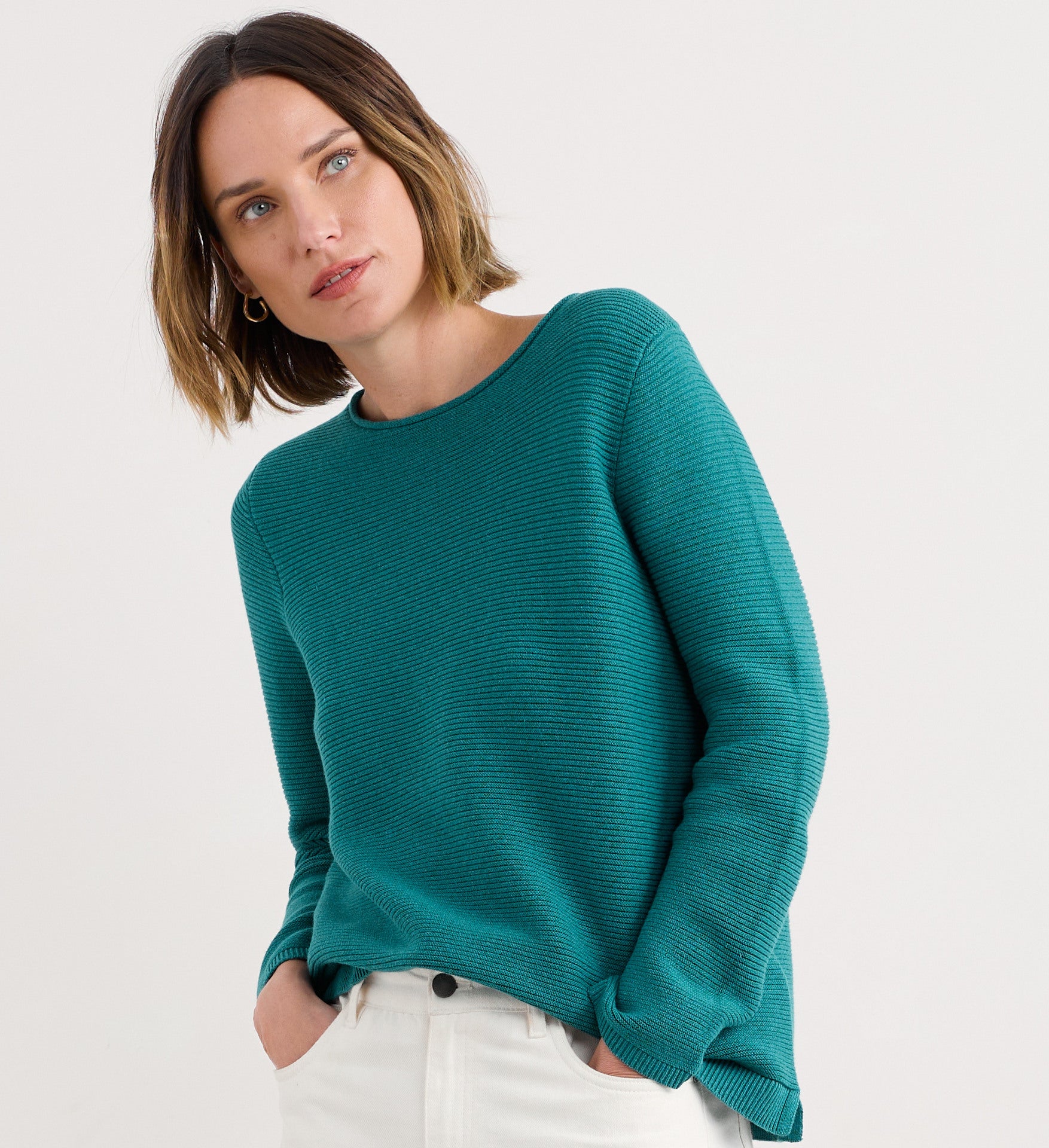This organic cotton jumper has a simple, easy-fit silhouette, bracelet length sleeves and a crew neck with a pretty rolled trim. The fuss-free shape lets the ripple stitch texture and fresh Cornish colours shine. A key transitional piece that's perfect for layering.
