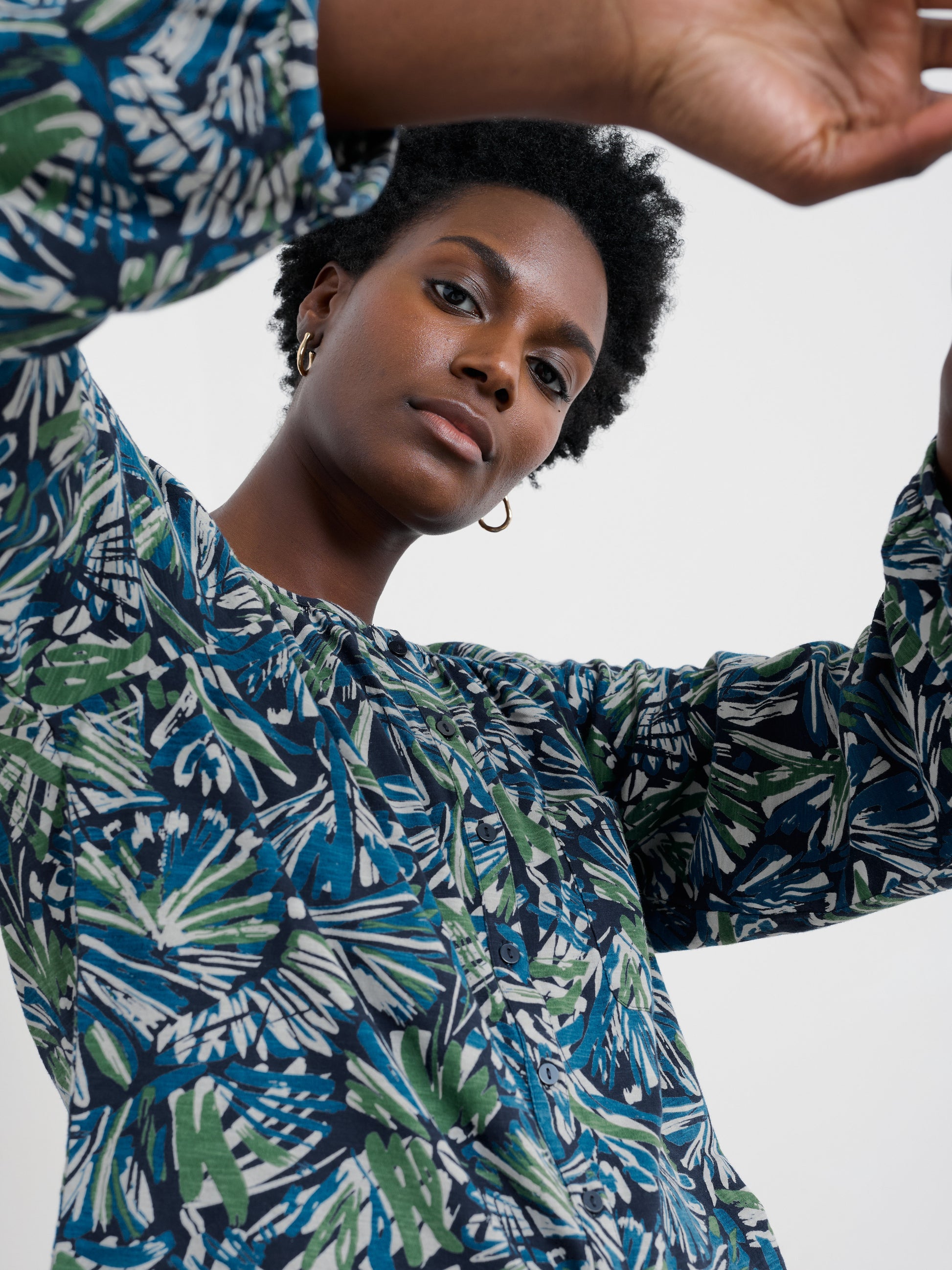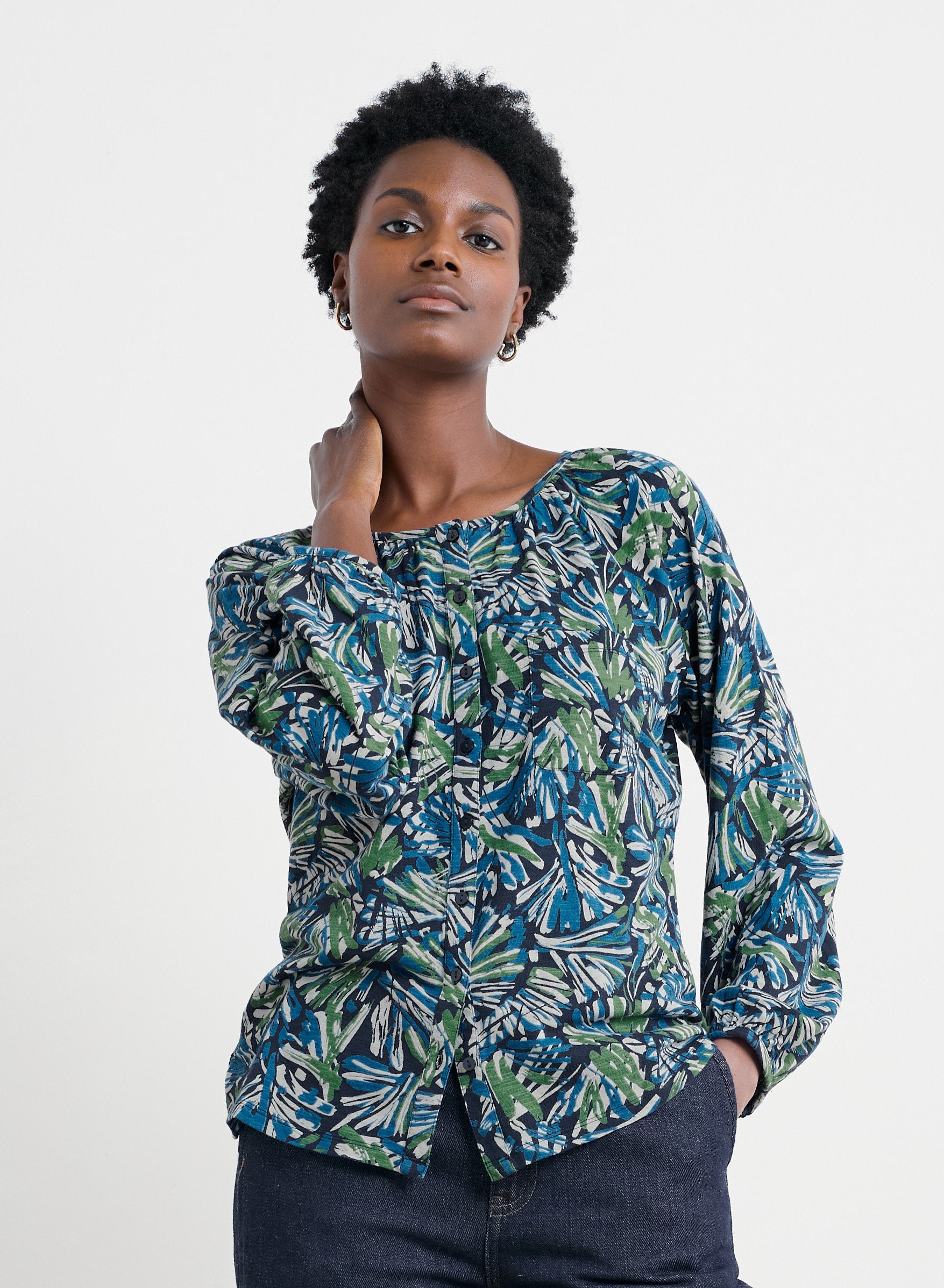 An easy-to-wear top in a soft organic cotton jersey. We've given it a scooped collar and button through detailing. Gathers at the neckline give the Mallow Top an easy swingy movement, which is echoed in the blouson long sleeves.