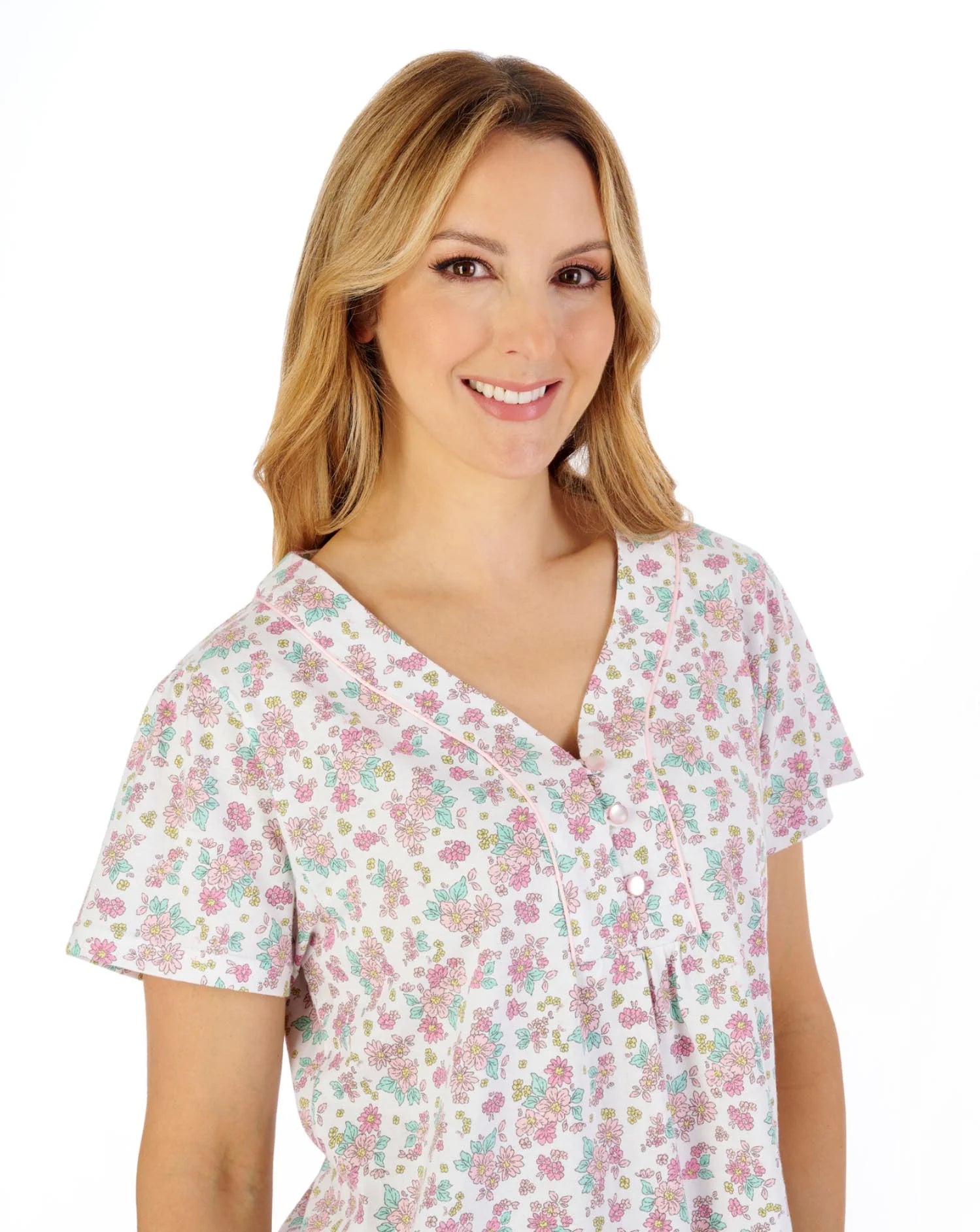 Made from 100% cotton, this 42" length nightdress features a timeless floral print and a comfortable jersey fabric. With a short sleeve design and contrast satin piping, it offers both style and functionality. The 3 button placket and gathers to the centre front add extra detail.