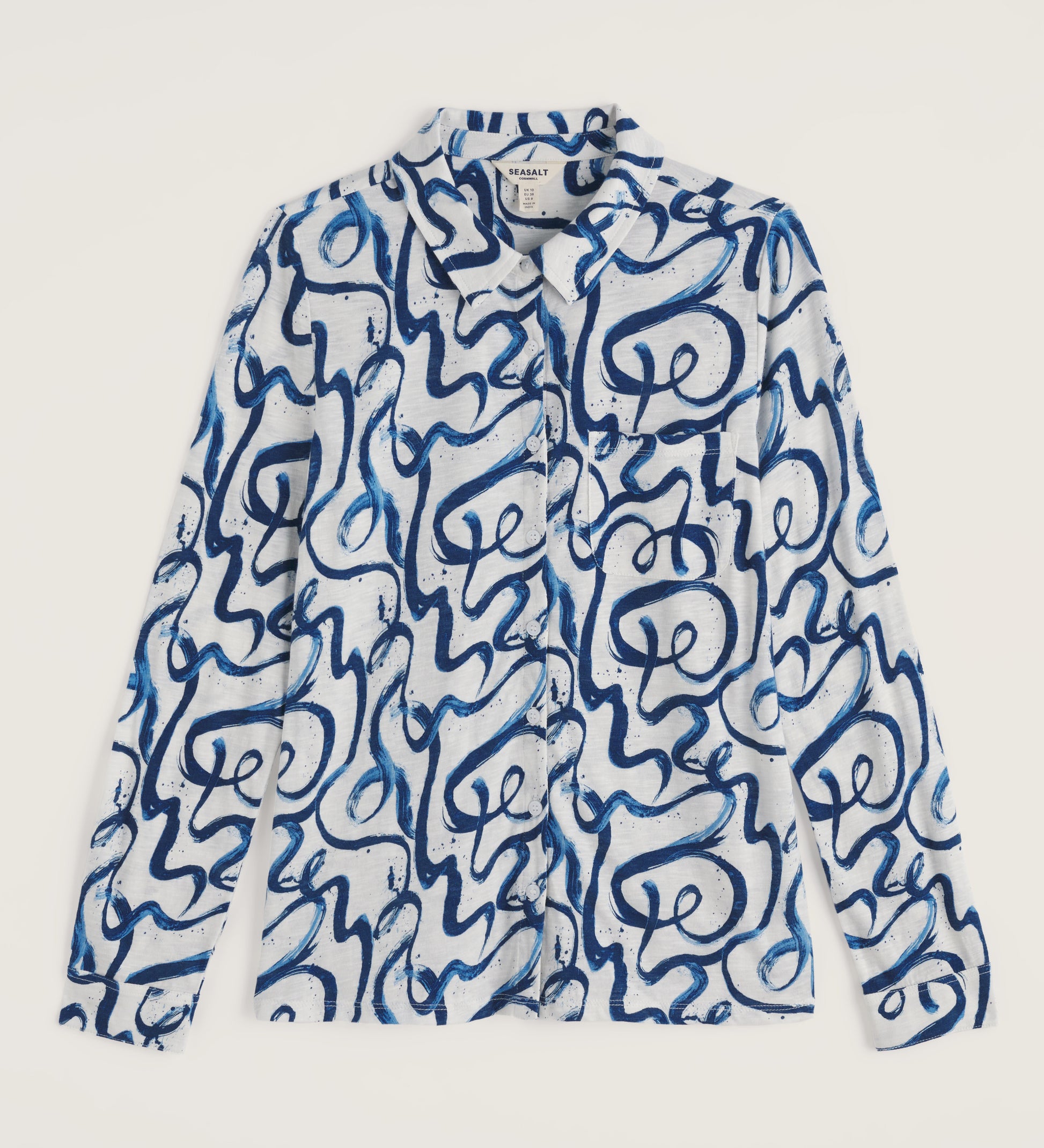 Our versatile jersey shirt is so easy to wear, with its gently curved hem and skimming semi-fitted shape. Timeless shirt details include a button-through front, a collar and long sleeves that finish in buttoned cuffs. It's finished off with a single chest pocket. Wear loose over your favourite jeans or draped over a dress as a lightweight extra layer.